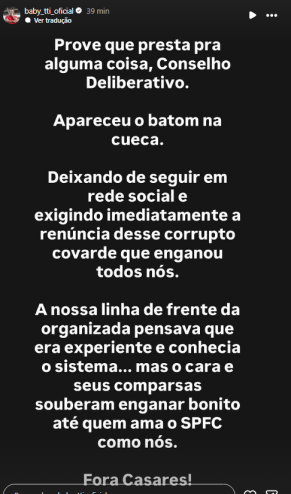 3 de 4Dirigente de organizada pede saída de Casares • Reprodução / Instagram