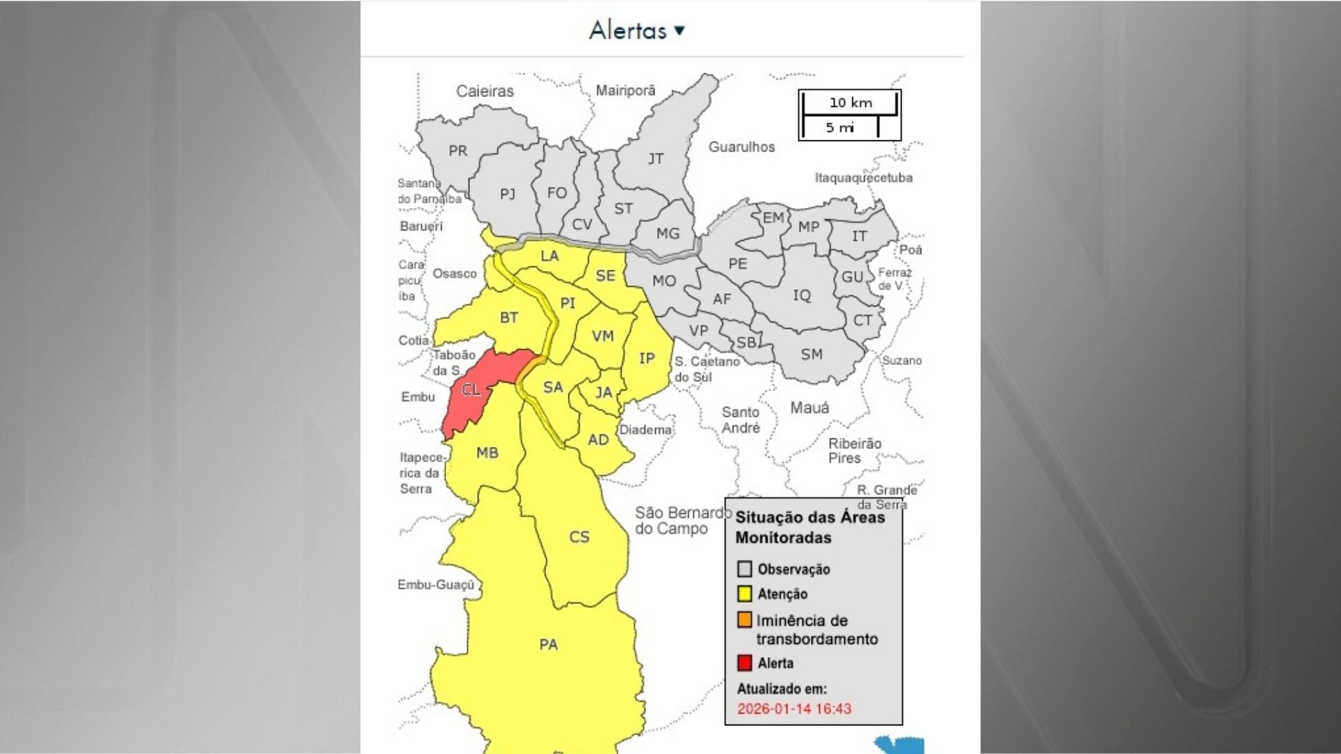 A Defesa Civil de São Paulo emitiu na tarde desta quarta-feira (14) um alerta severo para chuvas nas Zonas Oeste, Central, Sul e Leste da capital paulista.