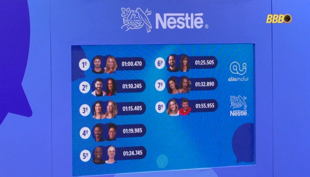 A dupla Paulo Augusto e Pedro foi eliminada após Pedro apertar o botão antes da hora. Jonas e Sarah Andrade se destacaram e registraram o menor tempo da disputa, completando a prova em apenas 1 minuto. Eles seguiram na disputa para a fase seguinte um contra o outro em um jogo de sorte e Jonas foi o vencedor.